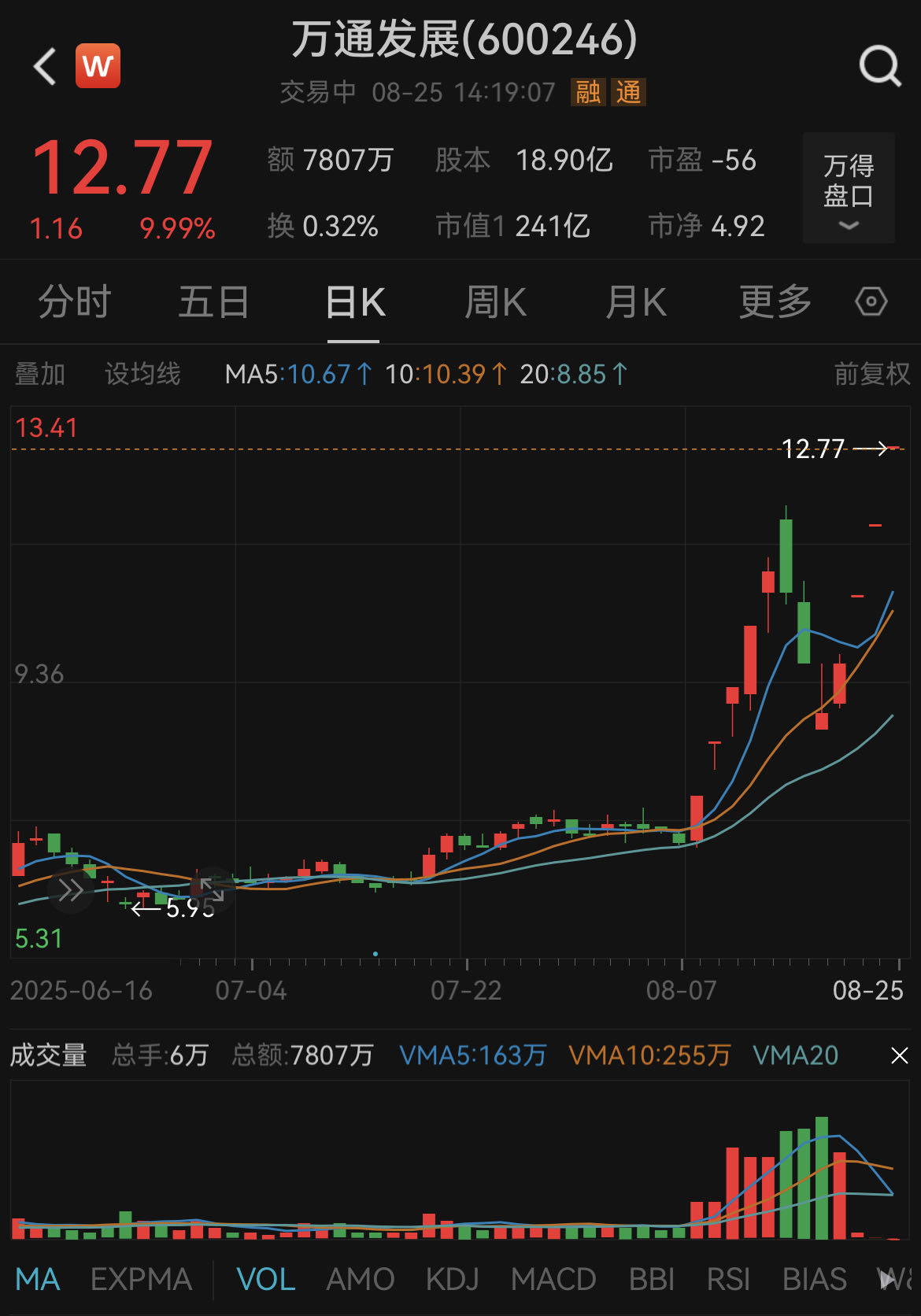 8月25日,万通发展(600246.SH)股价再度涨停,报12.77元/股,总市值达241.4亿元,已连续3个交易日“一字”涨停,而这一波异常行情恰好发生在公司董事长王忆会被公安机关拘留之后。